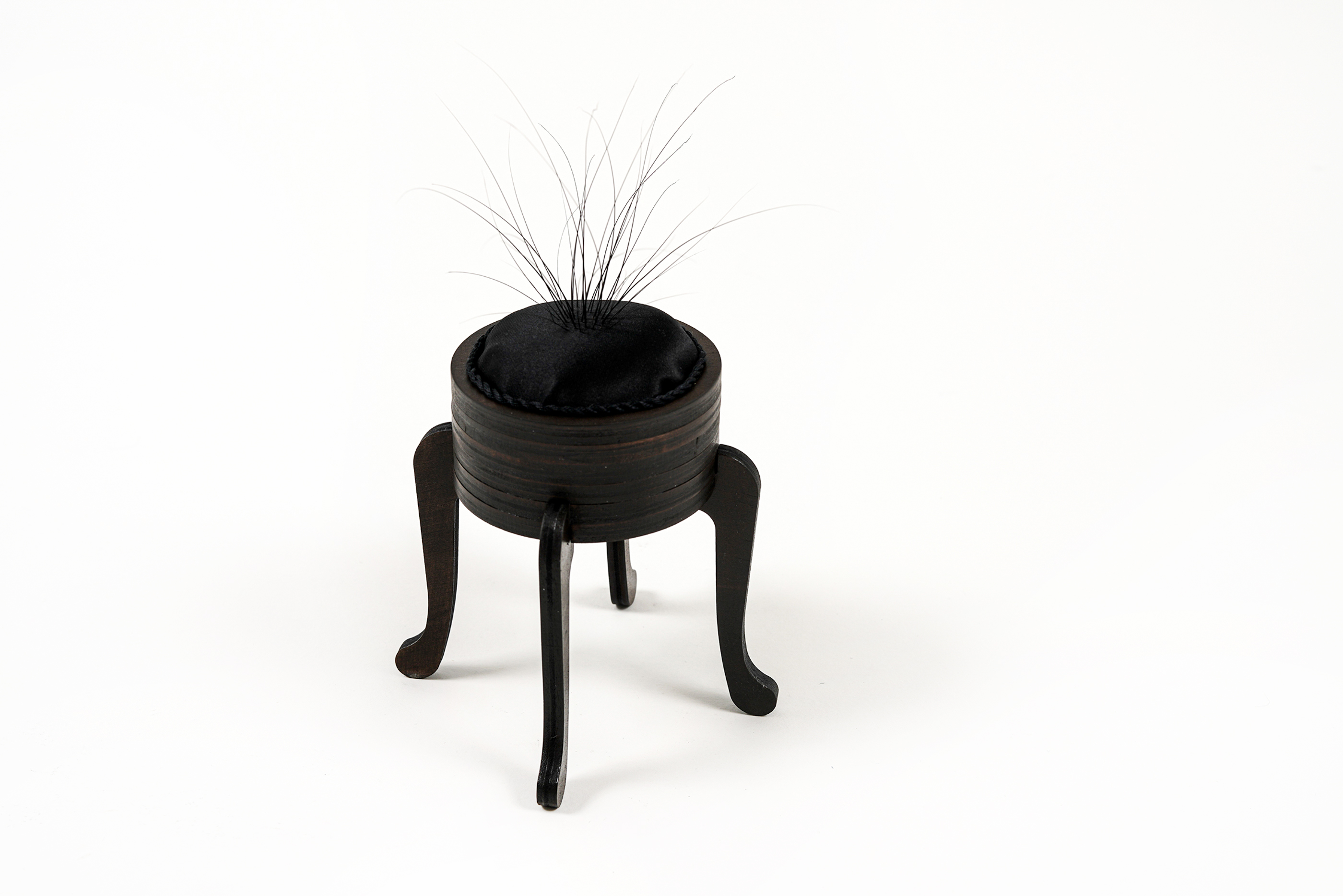 At some point, the idea of fabricating a pin cushion came. One that resembled the wooden-footed furniture in our home & of Bruce himself, which could display these sheddings. At the center is a small pouch stuffed with dried coffee grounds, a material that provides good grit & weight. Also used to fertilize our house plants. Another layer of the fabric is tightly wrapped around & embedded in the stand. [2025].