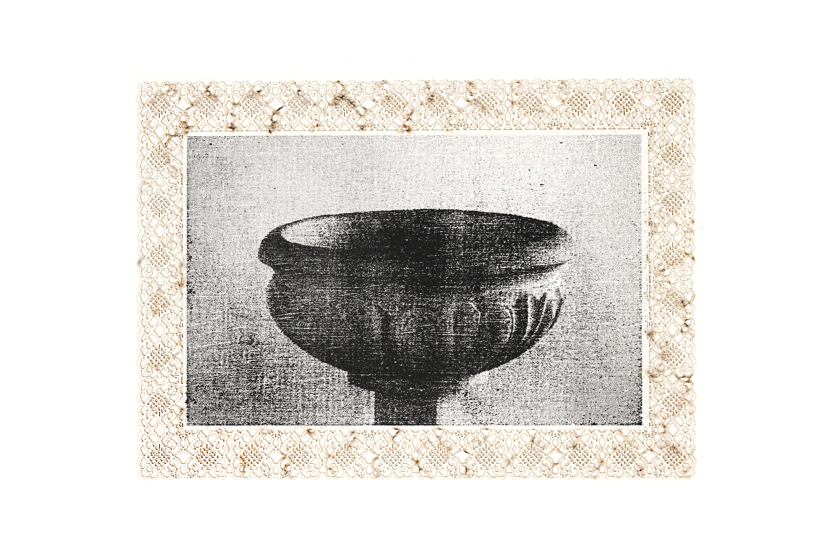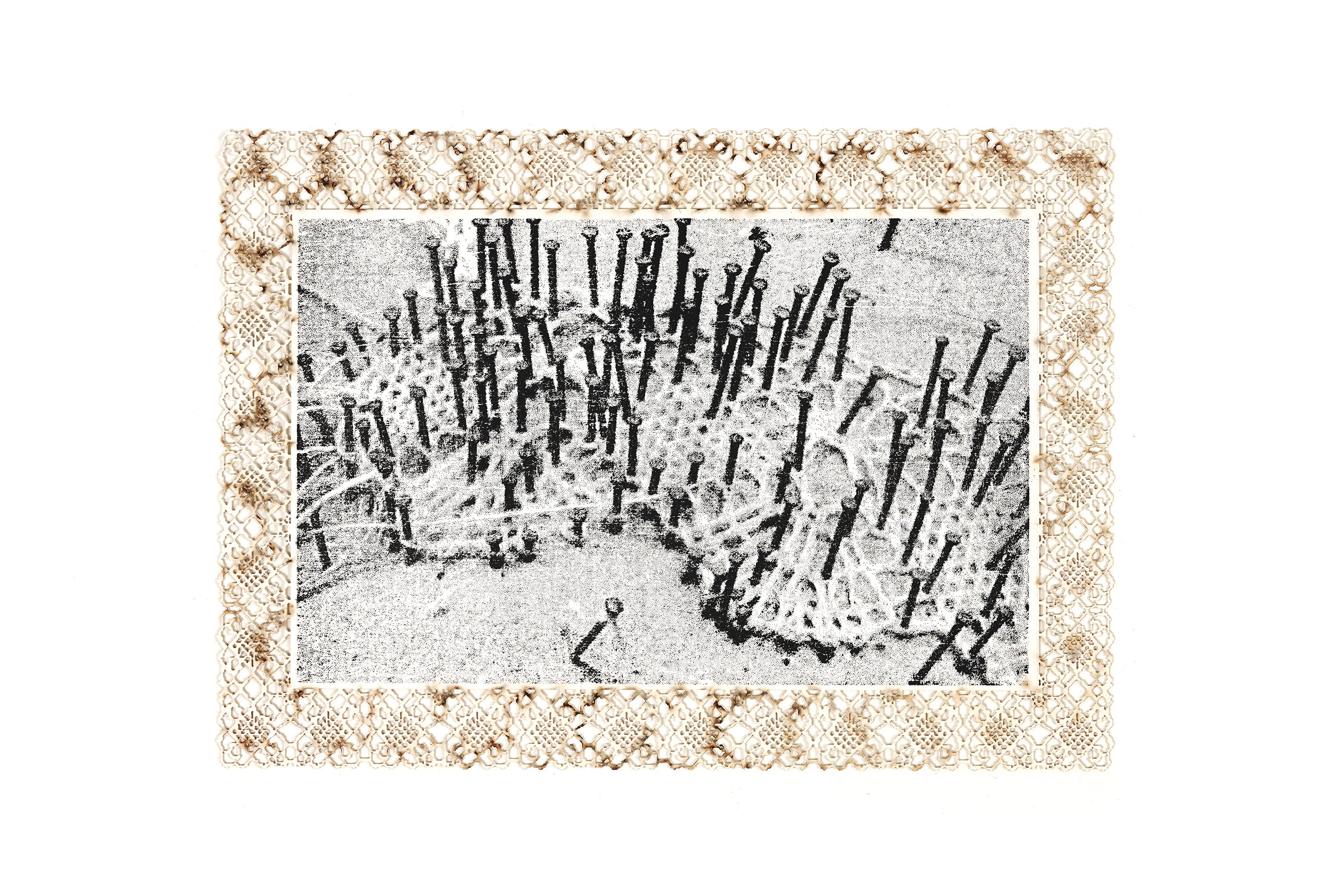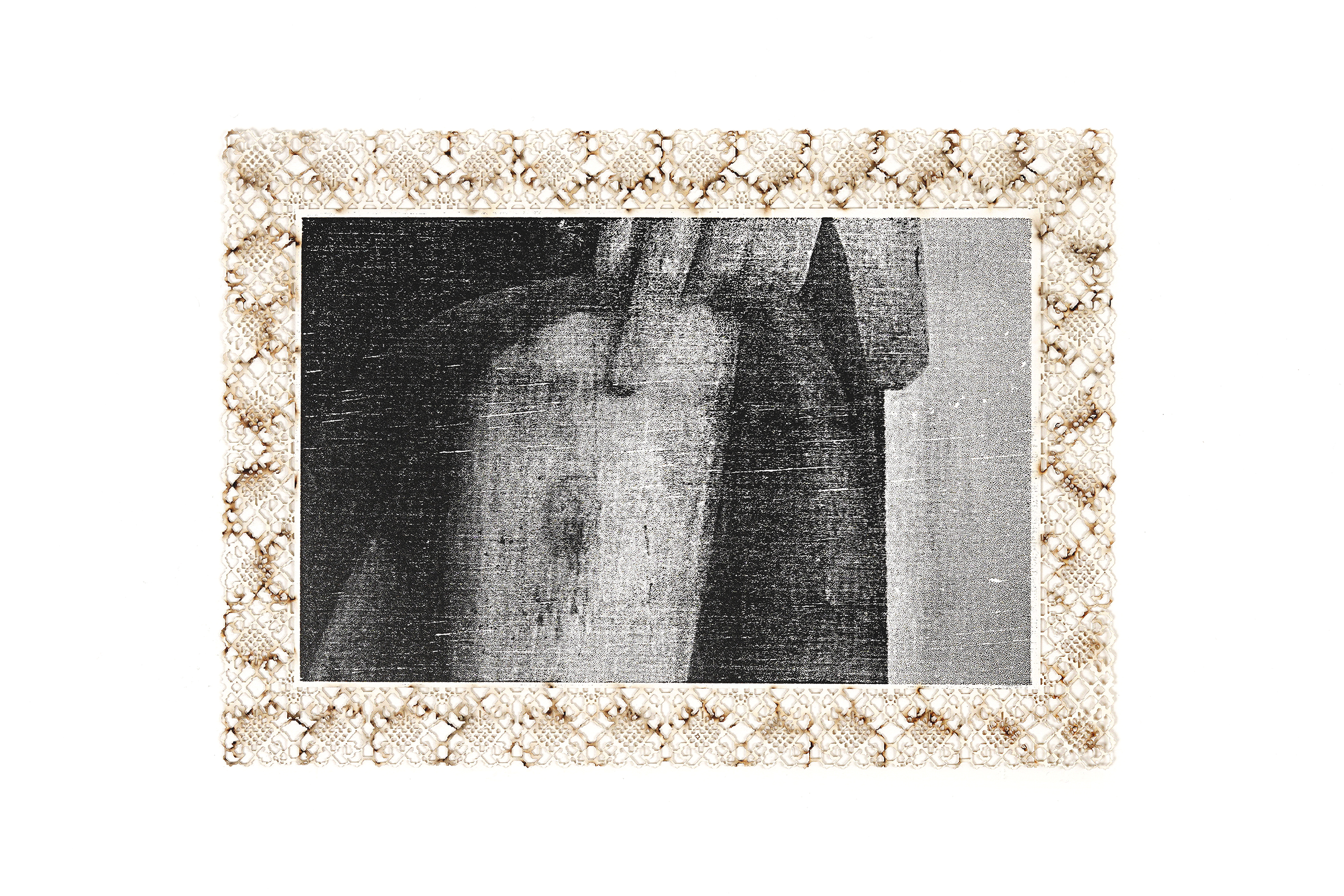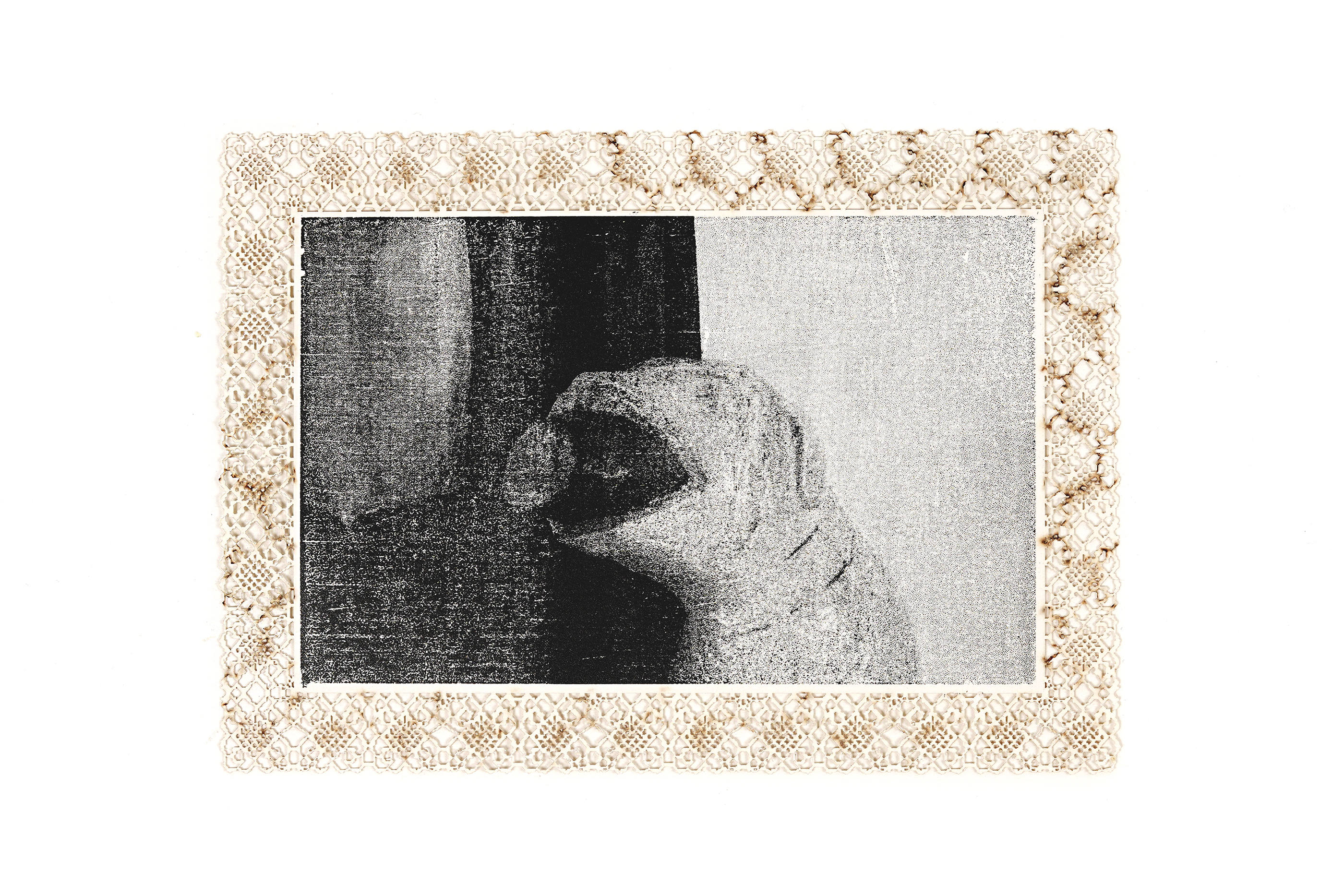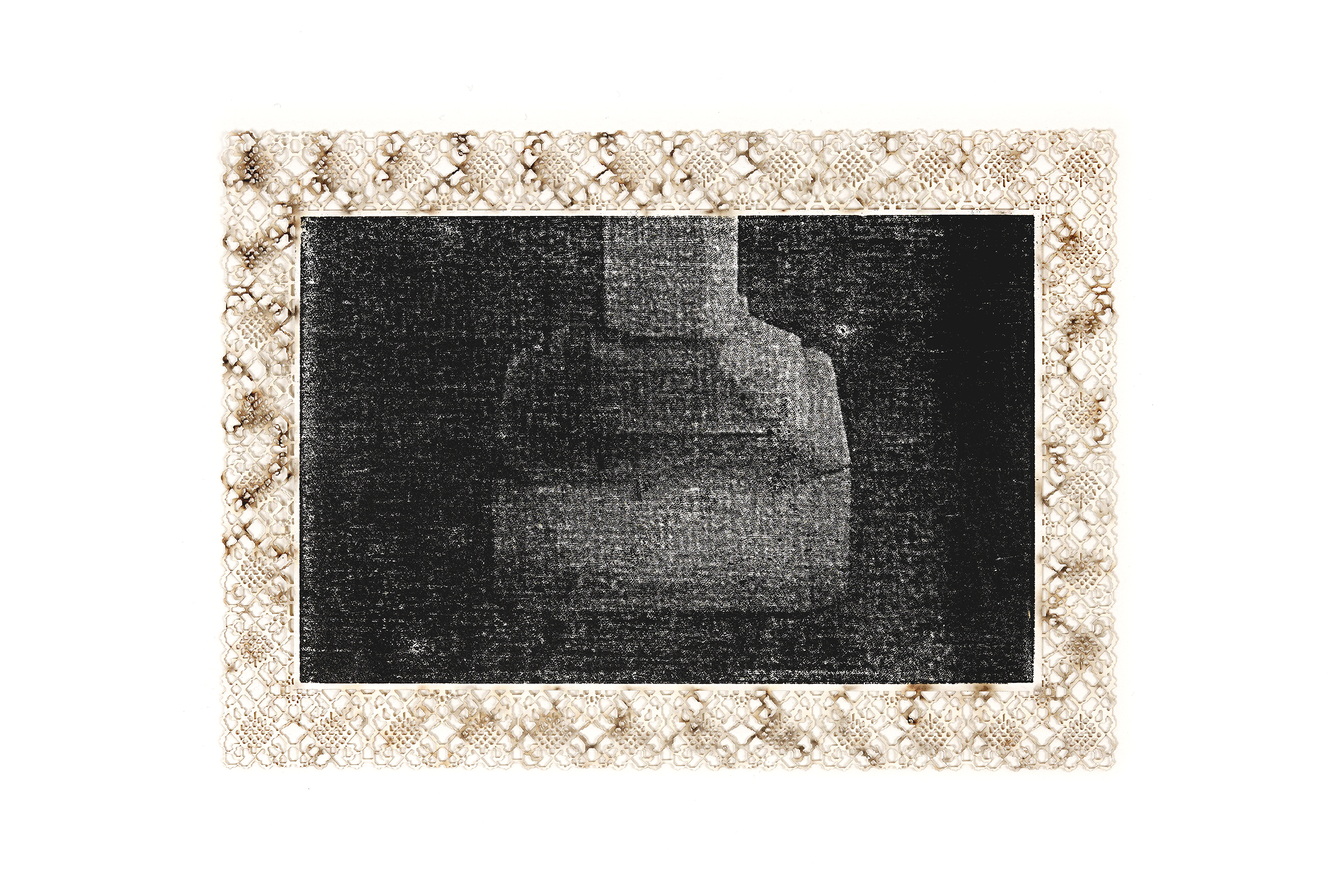 The bobbin lace technique became the inspiration for the paper edge, which was hand pixelated before laser engraving on unprinted cotton paper. Burn marks are intentionally left facing up on the visible side, comparing the machine pattern with that of the lace & referencing the endured damage. With the exception of the lace print, subjects are split to form diptychs, highlighting the details of place in close proximity. This was my first experience with woodblock relief printing, to preserve the integrity of the image & the archive. [2025].